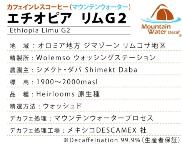 このカフェインレスコーヒーは、標高5,500mのメキシコ最大の山“Pico de Orizaba”の天然水を使用した「水抽出法」により含有カフェインの99%を除去。